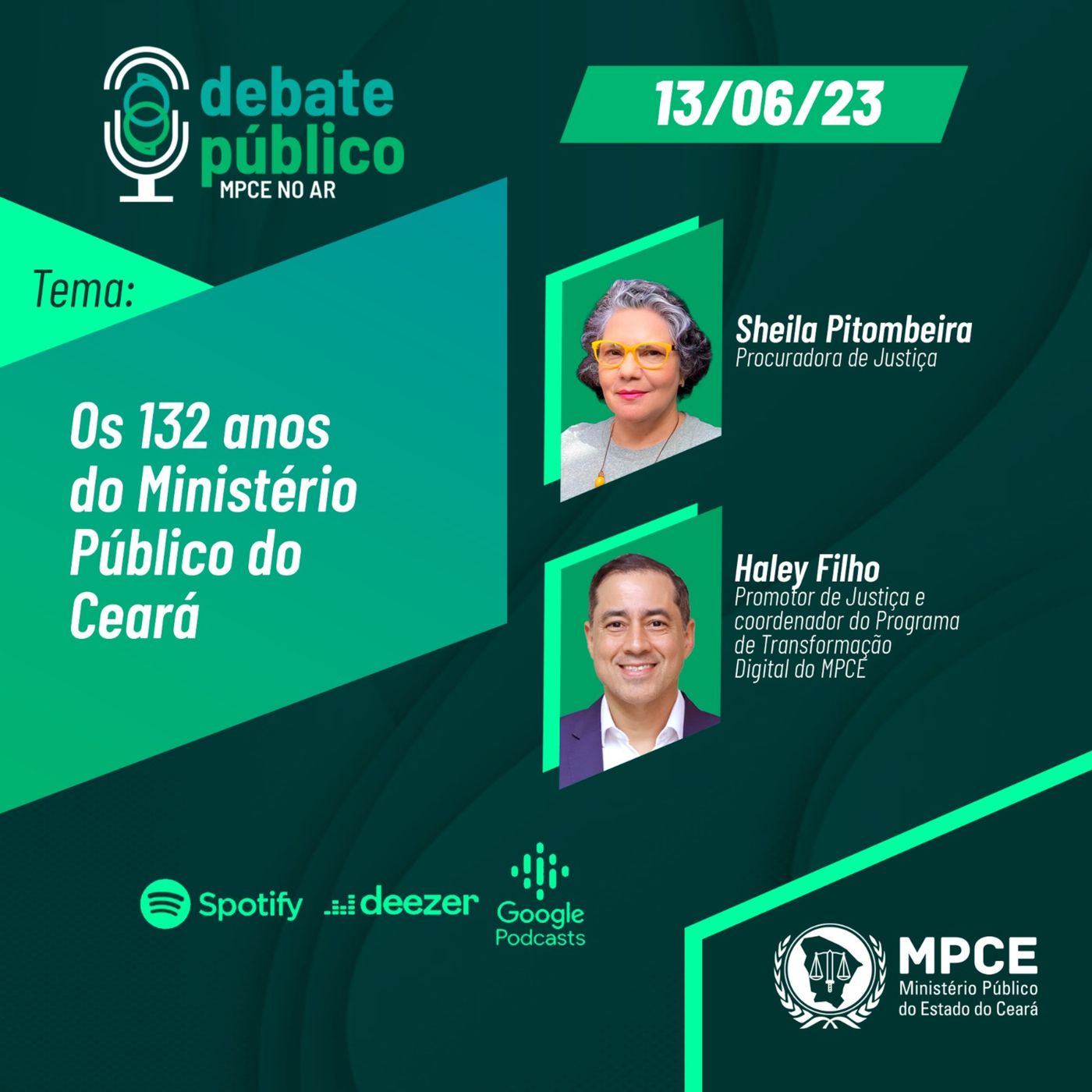 O Debate Público desta terça (13/06) trata sobre os 132 anos do Ministério Público do Ceará. Os entrevistados são a procuradora de Justiça Sheila Pitombeira e o promotor de Justiça e coordenador do Programa de Transformação Digital do MPCE, Haley Filho. Tem ainda o giro de notícias dos repórteres do MPCE em todo o Estado. O Debate Público é uma produção em áudio, transmitido toda terça-feira, a partir das 16h, pela Rádio Universitária FM 107,9. O programa também está disponível no Spotify, Deezer e Google Podcasts e no site do MPCE