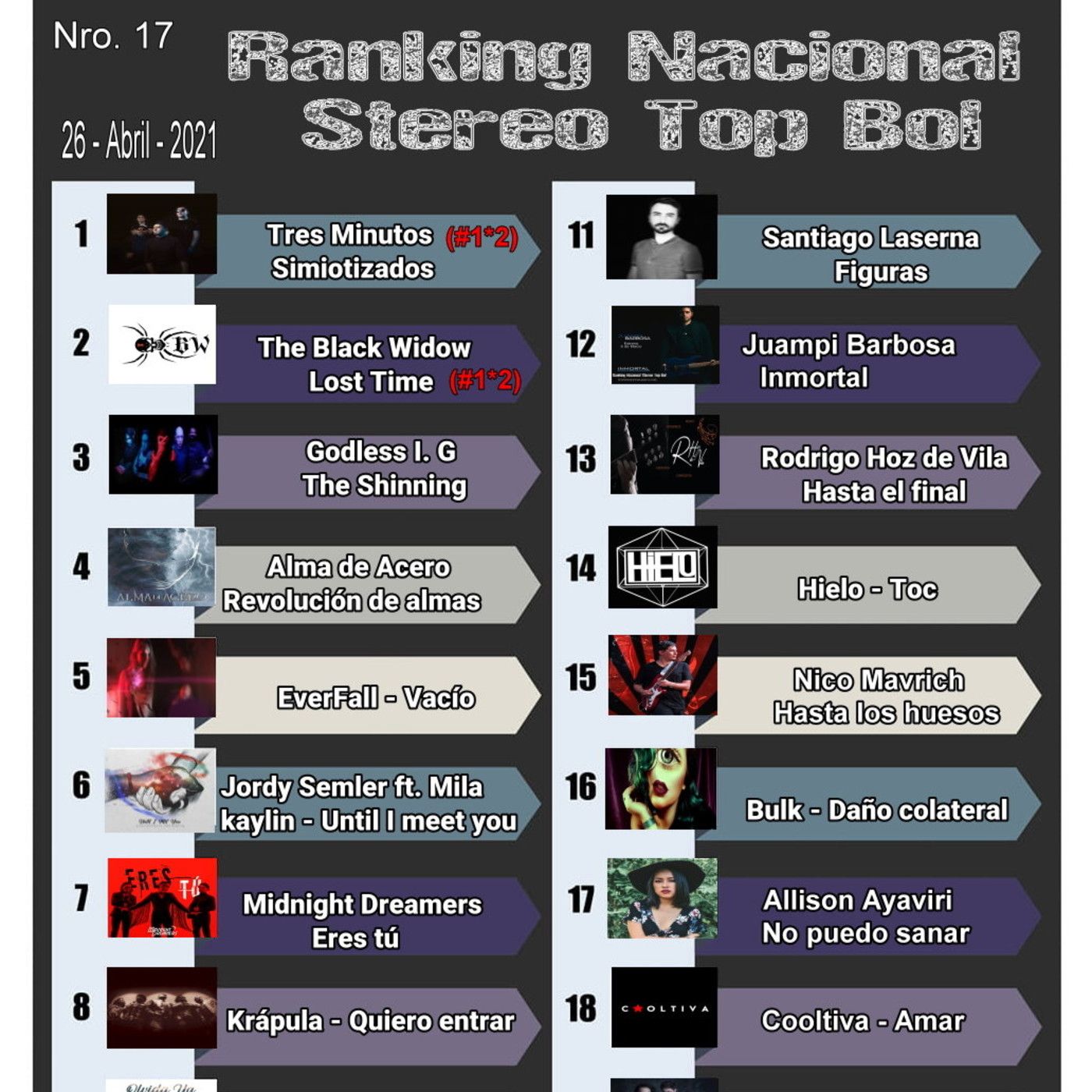 Ranking Nacional Stereo Top Bol Nuestro #1x2 seguidas "SIMIOTIZADOS" Tres Minutos Estrenos : Jotape Produce, Dani Sagar, Isadorian Estreno y entrevista a Aeroplan Teto De Ugarte Estreno Internacional :México Jorneth Brasil : SubRock Sugerencias : ALCOHOLIKA L.C., Boulevard TRIAL Rock Sucre Mar de Dirak , Gustavo X Silva Recuerdos Plan Mangosta y los 20