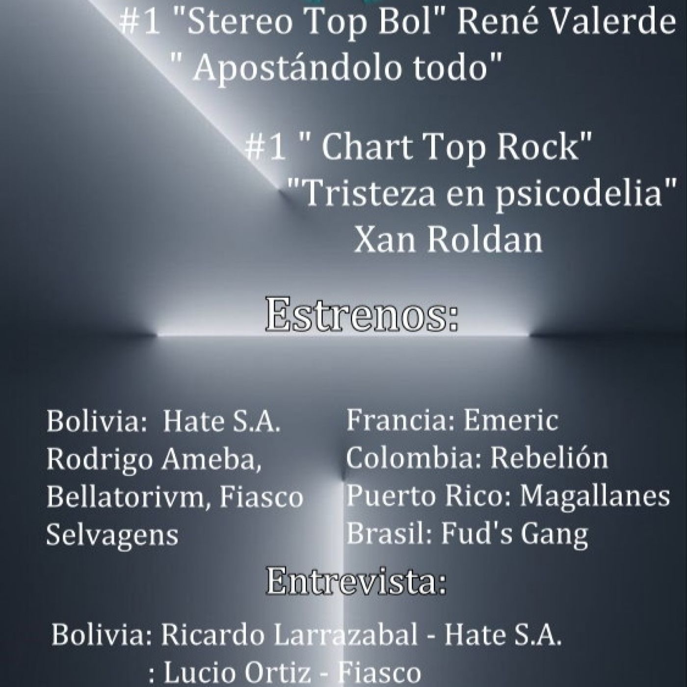 Programa 36 - 2022 #1 Stereo Top Bol René Valverde "Apostándolo Todo #1x2 Chart Top Rock Xan Roldan " tristeza en psicología ESTRENOS : Bolivia : Rodrigo Camacho Fiasco Selvagens Die With You BELLATORIVM Francia : EMERIC Colombia : Rebelion HEAVY METAL Puerto Rico Banda Magallanes Brasil : Fud's Gang Entrevista : Ricardo Larrazabal HATE S.A. Recuerdos : Sian Siete La Luz Mandarina