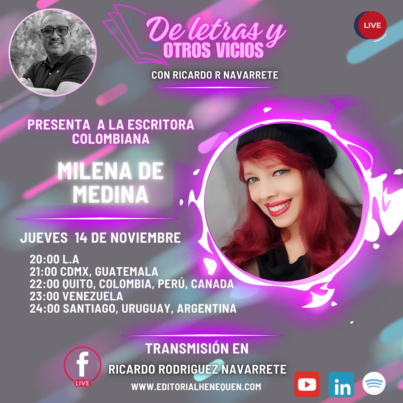 Estaremos con esta gran escritora de origen colombiano, quien nos hablará de su trayectoria como presentadora, escritora y motivadora. No te pierdas esta gran noche con la ganadora del premio "Águila de oro" a mejor programa de radio y televisión.