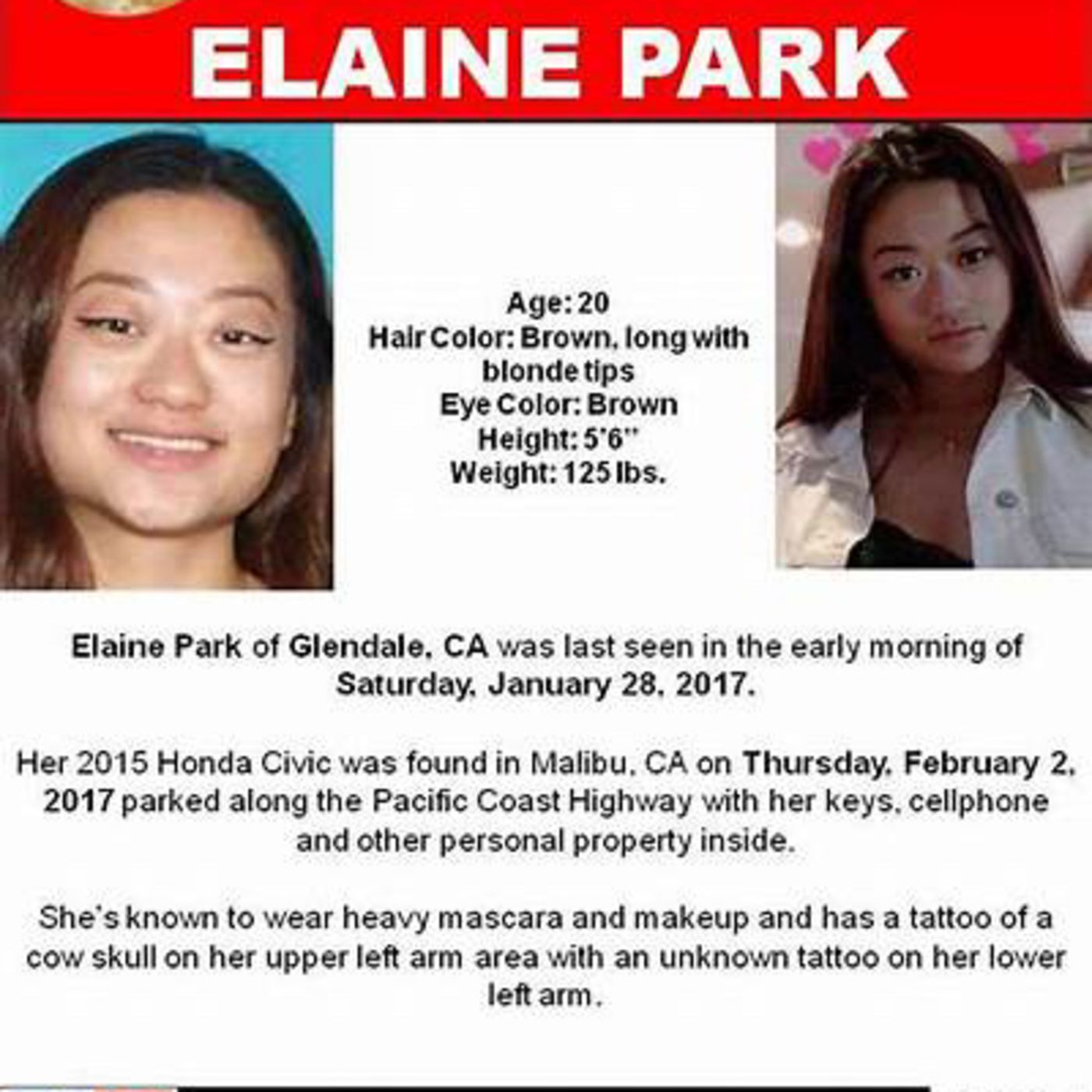 Elaine Park an aspiring actress has mysteriously disappeared... Let's help find her! --- Send in a voice message: https://podcasters.spotify.com/pod/show/unexplainedrealms/message Support this podcast: https://podcasters.spotify.com/pod/show/unexplainedrealms/support