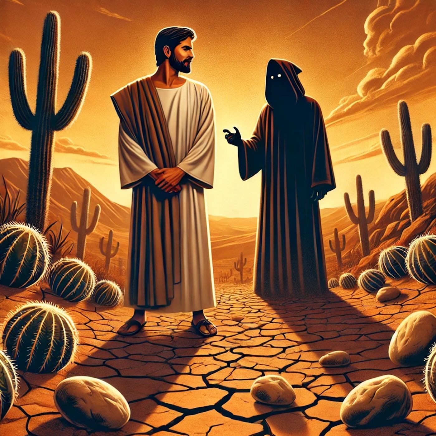 Após jejuar por quarenta dias e quarenta noites no deserto, Jesus sentiu fome. Satanás o tentou, sugerindo que transformasse pedras em pães. Jesus respondeu citando Deuteronômio 8:3, enfatizando que a verdadeira vida não depende apenas do alimento físico, mas de cada palavra que procede da boca de Deus. Este episódio destaca a importância da fé e da dependência espiritual sobre as necessidades materiais.