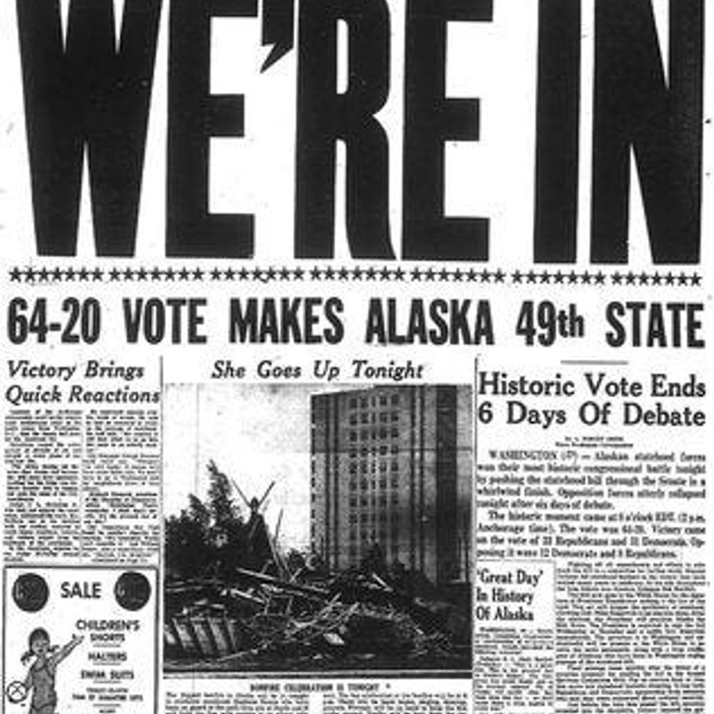 When Alaska finally made the transition from territory of the United States to becoming the 49th state – it was cause indeed for happy celebrations in Anchorage.“I remember being in the first grade at Denali Elementary. One day, we had to fill out a form. One of the questions asked, “what state do you live in?”. Our teacher told all of us to write “Territory of Alaska”.MaryThe Statehood ActThe man at the desk is President Dwight D. Eisenhower. Standing and on the left of the screen is Richard Nixon.The Alaska Statehood Act was enacted on July 7, 1958. However, for various legal reasons, Alaska had to wait until January 3, 1959, to officially be welcomed as the 49th state.BONUSRead more about the Alaska Statehood Act and discover.You Can Share This EditionIt’s so easy to share the fun and information about life in Anchorage, Alaska with your friends and family.And when you share Anchorage Memories VIP Club podcast with them, they will be so happy that they will buy you the car of your dreams… well, it could happen.Click on the following link:Thank you for reading Anchorage Memories VIP Club. This post is public, so feel free to share it.The Federal Building FlagA huge U.S. flag with a large 49th star was hoisted on the outside wall of the Federal building on 4th Avenue to celebrate statehood.If you look closely at the flag, you will notice the large star.Everyone either walking or driving down the street enjoyed looking at the flag.The BonfireThere were plenty of celebrations in Anchorage when Alaska became a state.Everyone lined the street for a parade, and there were other events all over town.But the celebration everyone seems to remember was the bonfire pictured above.“My family and I attended the statehood bonfire celebration. I was only in the first grade at Denali Elementary and didn’t really understand what was going on.Our family lived in downtown Anchorage, so my parents, 5 brothers and 2 sisters all walked to the bonfire. I remember how excited and happy everyone was. When they set the wood pile on fire, I remember the bonfire became big and hot.Later, when we got back home, we talked about it and I started to understand more about why everyone was celebrating and that we had become the 49th state in the U.S. It was a proud and happy day I’ll always remember.”MaryDid You Remember Your Brownie Camera?Take a look at Anchorage resident Dick Hoffman’s memories of the Statehood celebrations.Did You Know This?At first, the United States Congress feared that Alaska would be unable to raise enough taxes because of its small population, and that Alaska would become a welfare state.Then, 6 members of the Senate Interior and Insular Affairs Committee in the U.S. Congress went to Alaska to conduct public hearings to see for themselves how Alaskans felt about the idea of becoming a state.Alaskans decided not to let them forget that they wanted to become a state.Alaskans sent Christmas cards with the following wording:“Make Alaskan’s future bright. Ask your Senator for statehood and start the New Year right.”And Alaska’s women got into the act in an impressive way.They made bouquets out of the Alaska flower, the “Forget-Me-Not” and sent them to members of Congress.Following all this, a lack of interest could no longer be used to prevent Alaska’s statehood.What Are Your Memories?It’s been many years since Alaska first became a state and the 49th star was added to the U.S. flag.When I was in the 3rd grade, our family had returned to the “lower 48” for a time and I was attending school in Texas. Our class had a project where we were studying the 48 United States.At one point, my teacher asked which state I was from, and I proudly said “Alaska.”My teacher then informed me that Alaska wasn’t a state. I became upset and said, “but we lived there.” The teacher informed me that Alaska was a Territory of the U.S.I became even more upset and thought to myself – “how could mom and dad take me out of the country like that?” Later that evening, mom and dad told me all about how Alaska was a part of the U.S. and what being a territory meant. After that, I was OK with it.Some years later, when Alaska became the 49th state, I was very proud.Contact UsWe were having so much fun enjoying this edition of Anchorage Memories VIP Club podcast, that it’s difficult to believe it’s time to say goodbye until next time.Did you learn something new about Alaska Statehood? We did.Do you have a comment, or just want to say, “I was at the bonfire.”You can reply to this email, or you can Contact Us right now.Until Next TimeMike and MaryAnchorage Memories.com