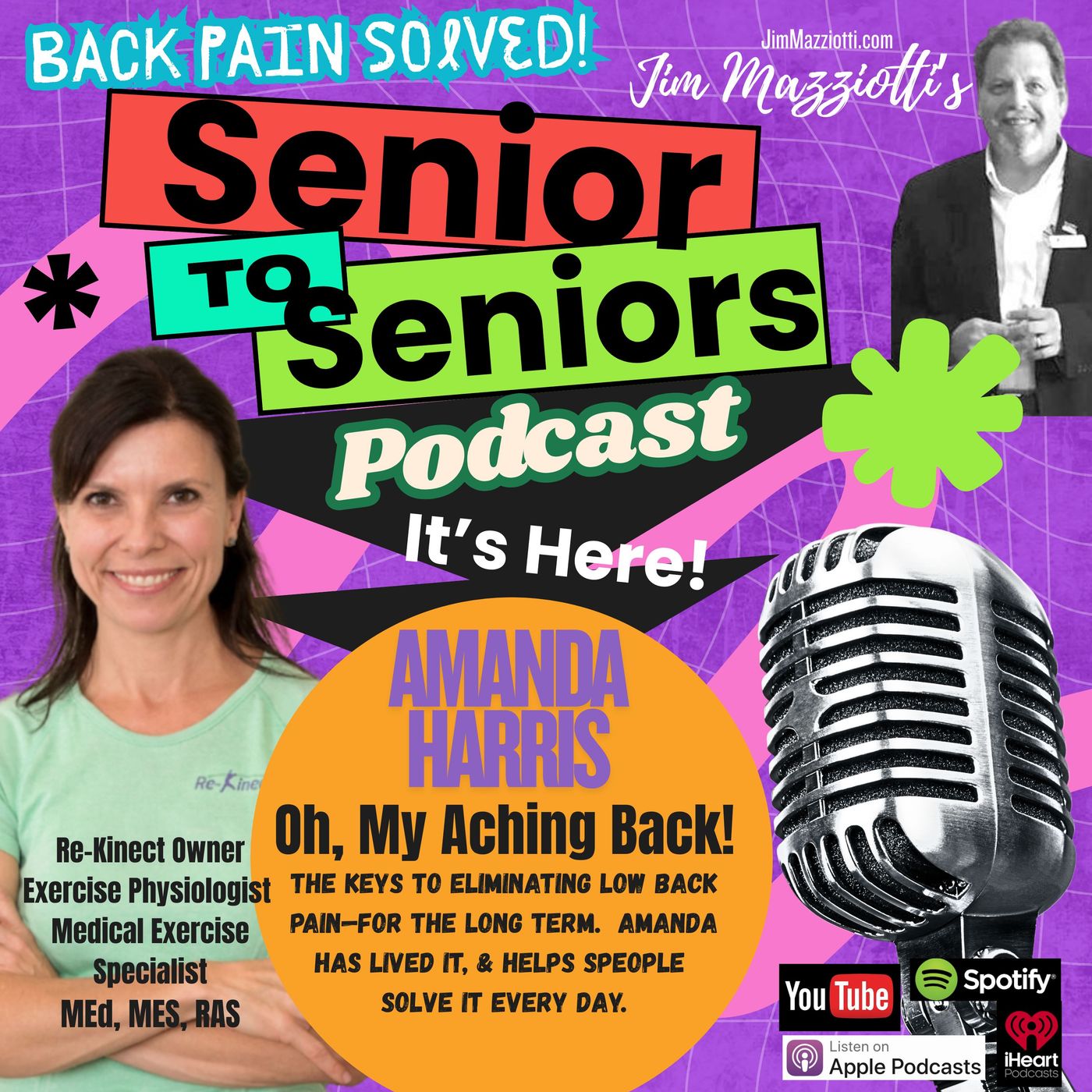 Oh, my aching back!!! Have you ever said those words? My guest, Amanda Harris, specializes in working with people who have chronic low back pain for any number of reasons, including disc herniation, spinal stenosis, and various spinal surgeries. In addition, she has extensive experience working with those who have undergone total knee, hip or shoulder replacement. Amanda has over 25 years of experience in post-rehabilitative and medical exercise and is passionate about helping people return to the activities they enjoy after injury or surgery.