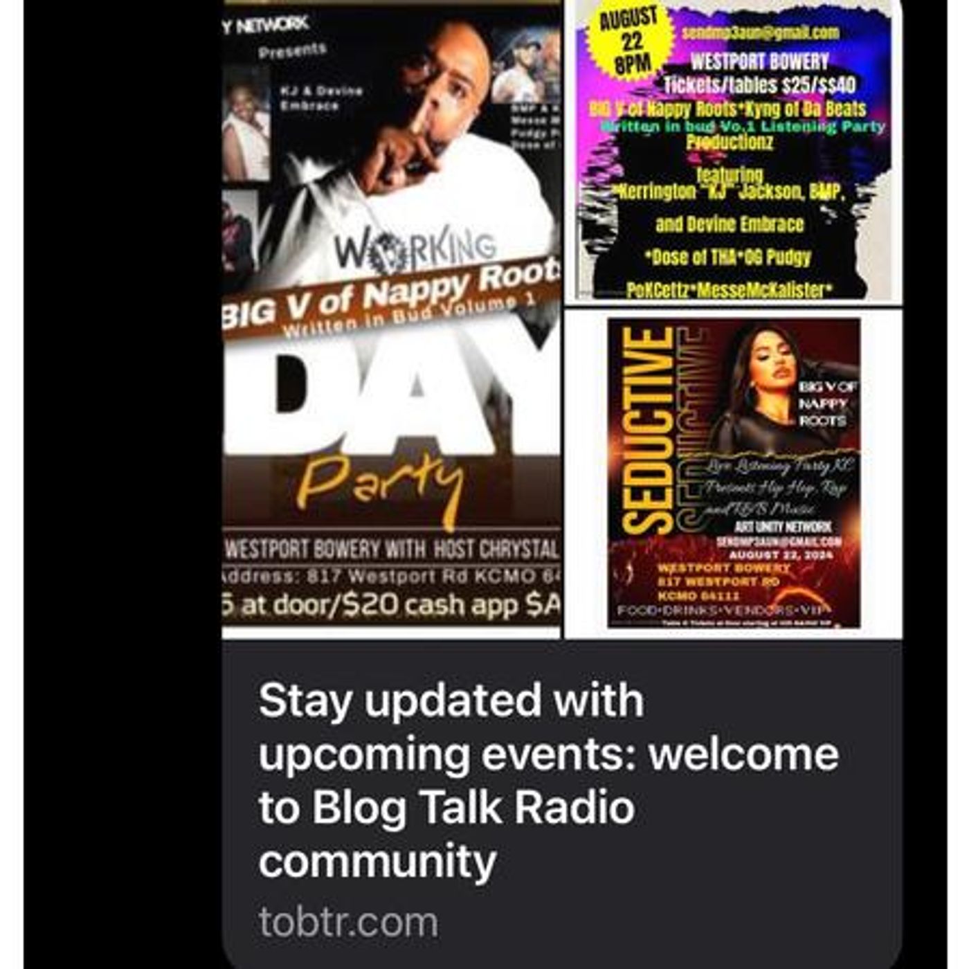 New Music, upcoming events! Get your tickets Big V of Nappy Roots Day Party KC "Written in Bud Vo. 1" sendmp3aun@gmail.com Art_Unity_Network IG Art Unity Network FB CEO Chrystal TuckerĀ Westport Bowery 817 Westport rd. Dine in entertainment Aug 22 from 8-11pm http://tobtr.com/s/12352417