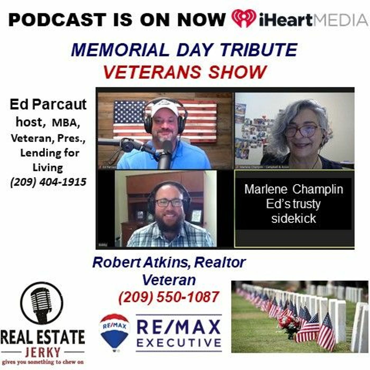 We pay tribute to the family and friends of military men and women who made the ultimate sacrifice for our freedom with two solid Veterans, our host, Ed Parcaut, MBA, Veteran of USN and President of Lending for Living (209)404-1915 and guest, Robert Atkins, Realtor, Veteran of USN, RE/Max executive, Modesto. These two Vets dedicate a great deal of time, energy and resources into helping Veterans get the most from their VA benefits and are experts at making home ownership happen for them. Real Estate Jerky broadcasts live every Saturday at 12n and Sundays at 10a on Power Talk 1360 KFIV and live stream too:https://ihr.fm/2UJo7GZ