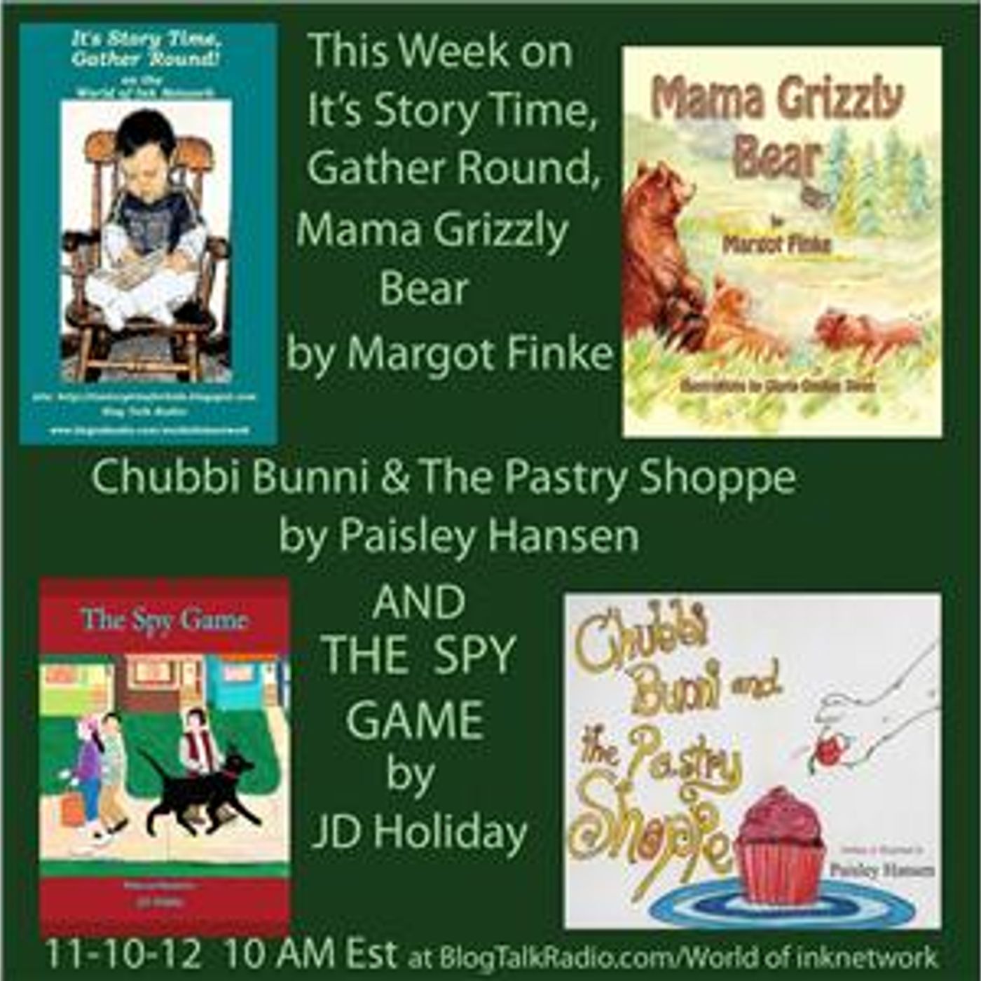 Join authors JD Holiday & Christy Condoleo on Saturday, November 10, 2012 at 10AM est, 9AM cst, 8AM mst & 7AM pst, for our Triple Special; Three picture books! ~Margot Finke's Mama Grizzly Bear; Paisley Hansen's Chubbi Bunni and the Pastry Shoppe; & JD Holiday's The Spy Game! For more on Paisley Hansen: http://blog.farmlandlibrary.org/2011/10/local-author-paisley-hansen-will-read.html For More about Margot Finke: www.margotfinke.com/ J.D. Holiday: http://thebookgarden.net Christy Condoleo: http://eppyscreations.com Show's site: http://itsstorytimeforkids.blogspot.com/