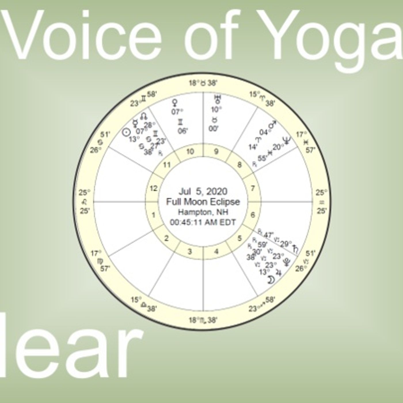 Hostess Lisa Winton and Swami Jayananda will talk about the Lunar Eclipse that happened on July 5, 2020 at 00:45 AM EDT in Capricorn 13° 38' which is also the Full Moon phase for Solar Eclipse 1/5/19 15° Capricorn 25'; the seed is in full bloom. In this show they will be discussing how to use the rational to help understand the absolute; in the rational there appears to be here and there along with now and then-- but in the absolute everywhere is here and all time is now. Listen as they explain the stellium (four or more planets in a sign) in Capricorn as a calling to obedience to the Divine Omnipresence. Welcome to the Voice of Yoga; we are talking consciousness! Join the Kriya Yoga Spiritual Advance to get the Light in your soul and experience Divine Omnipresence.