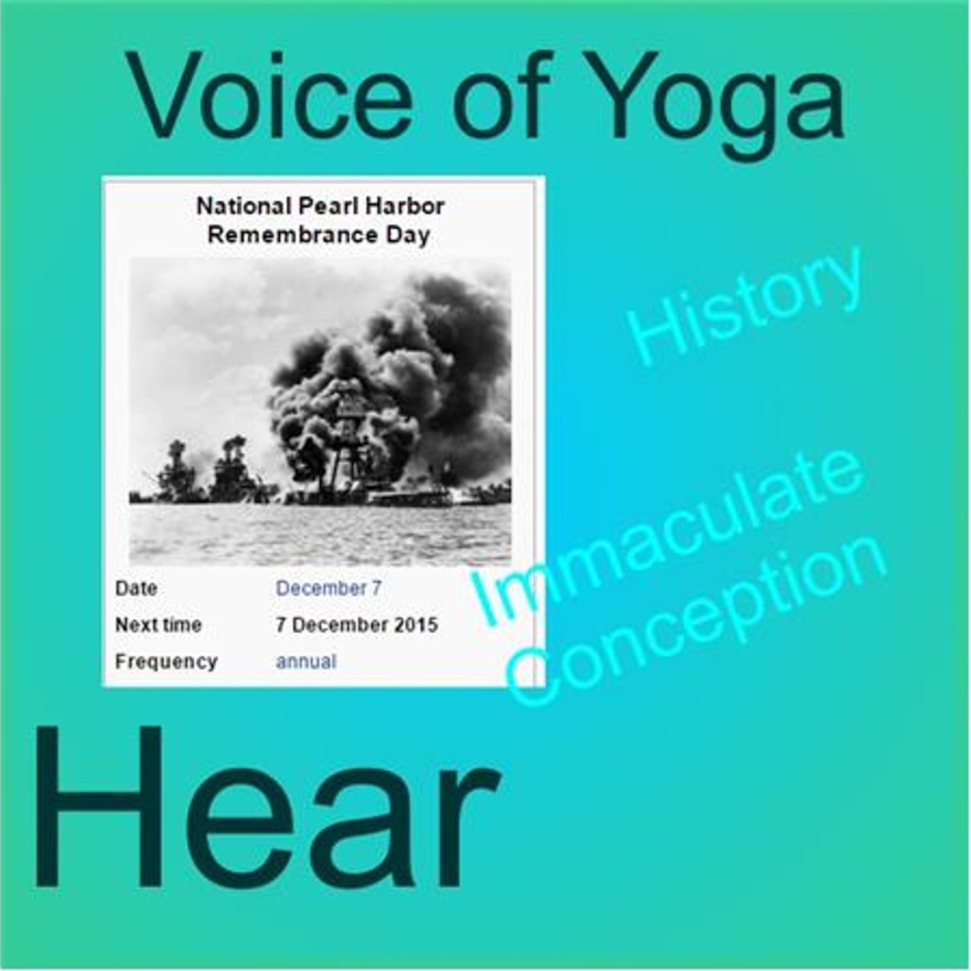 Hostess Lisa Winton and Swami Jayananda will talk about the deeper concepts surrounding the Christian holiday of the Immaculate Conception. This show will explain the meaning behind the statement "sex out of marriage is a sin." Listen as they discuss the mythology of Pearl Harbor and show how Kriya Yoga can help with real life circumstances. They will demonstrate why we all need Religion to create peace on earth. Welcome to the Voice of Yoga; we are talking consciousness! Join the Kriya Yoga Spiritual Advance get the Light in your soul and experience the benefits of Union with the Divine.
