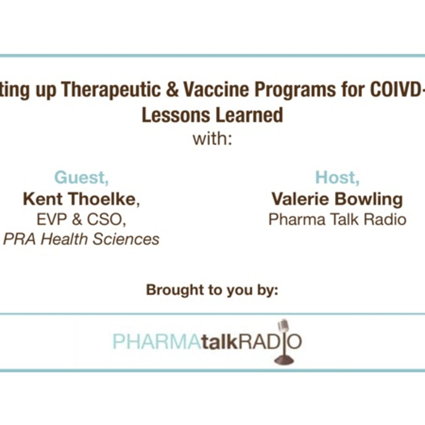 PharmaTalk Radio's Valerie Bowling welcomes guest, Kent Thoelke, EVP and CSO at PRA Health Sciences on his experience in rapidly setting up both therapeutic and vaccine focused programs for COVID-19. More specifically, they discuss lessons learned, what the new normal will look like for clinical trials and serving the needs of thousands of people who are currently in clinical trials. Guest Bio: Kent Thoelke is Executive Vice President and Chief Scientific Officer at PRA Health Sciences. Mr. Thoelke provides corporate oversight and strategy for Scientific & Medical Affairs, Pharmacovigilance & Patient Safety, Therapeutic Centers of Excellence, Real World Data, Patient Access & Experience, Digital Health & Virtual Trials, and their integration into operational delivery. Information about PRA Health Sciences, visit PRAH.com Information about upcoming conferences and podcasts on medicine development, visit theconferenceforum.org