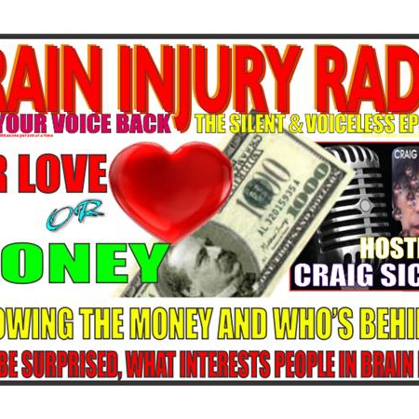 FOR LOVE OR MONEY – HOSTED BY CRAIG SICILIA What’s your story, why do you want to be part of brain injury, but more importantly the people who are your support what’s their story. Why do they do the things they do. Is it just a job and if the pay check goes away so do them, is it to make more money. There is a lot of money in brain injury a lot, personal injury is the highest profit, the system has it so you need a lawyer to be anything, a insurance company you paid your whole life will play games and string it out, your health insurance will want any settlement money to cover what they paid out, Now that you cognitive benefits expired your eligible for mental health help, these guys are really scary they have their own courts and hold you if they feel like it so don’t piss em off and your insurance will pay 500 plus in prescription meds each month . You doctors will say your physical where its going to be sending more fear but you will be kept in the medical model and they will want to study you to see why you’re a messed up person, and those who say they service us will collect millions of dollar and monetize ever aspect of our injury. if theres a penny they seem to take credit for many organizations hard work and alienate them by wanting ownership over everything and these folks behind the scenes have been are voice for decades is it any wonder we are silent we have never had a voice. And any chance we get survivor groups and their leaders between egos and being left out for so long combined with their own passion keep them from becoming unified what a mess, how do we get our own voice, how do we unify. Share your tales success and failures we must keep up the good fight,