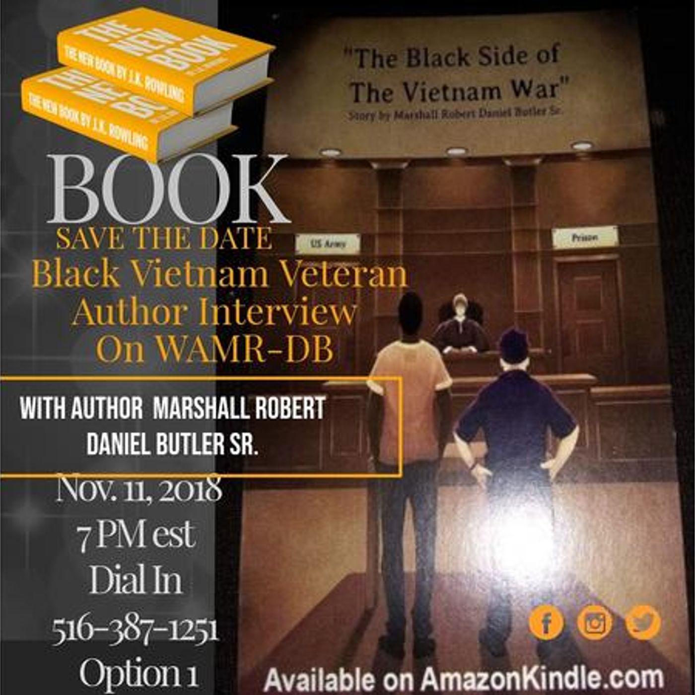 WAMR-DB Radio Nov. 11, 2018 @ 7pm est 516-387-1251 option 1 Veterans Day Exclusive Interview with Author Marshall Robert Daniel Butler The Black Side of The Vietnam War is a story about a seventeen- years old name Marshall R.D Butler. After he got a letter from the U.S Government to report to the Draft Board ,little that he knew, he was drafted into the military. This book is about his experiences, how he was treated as a black man in the military and what he saw and needed to do to stay alive. . Check this out: The Black Side of The Vietnam War Marshall Robert Daniel Butler Sr Amazon Kindle $4.99 https://www.amazon.com/dp/B07H6QKXQY/ref=cm_sw_r_sms_awdo_t1_UHl6BbGB9XJ6A