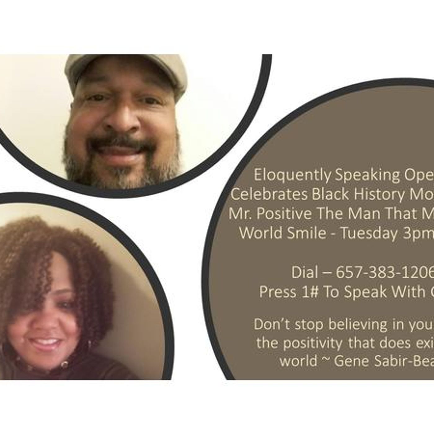 Eloquently Speaking Open Mic Celebrates Black History Month With Mr. Positive The Man That Makes The World Smile - Tuesday 3pm 2/5/19 Dial – 657-383-1206 Press 1# To Speak With Gene and give him an encouraging word. Many people around the globe, receive a good morning message from Gene that is full of positive energy that starts their day! Today's interview is going to be full of fun and laughter as we make him smile and honor him for Black History Month! Meet the man, the father, the poet and the motivational speaker!