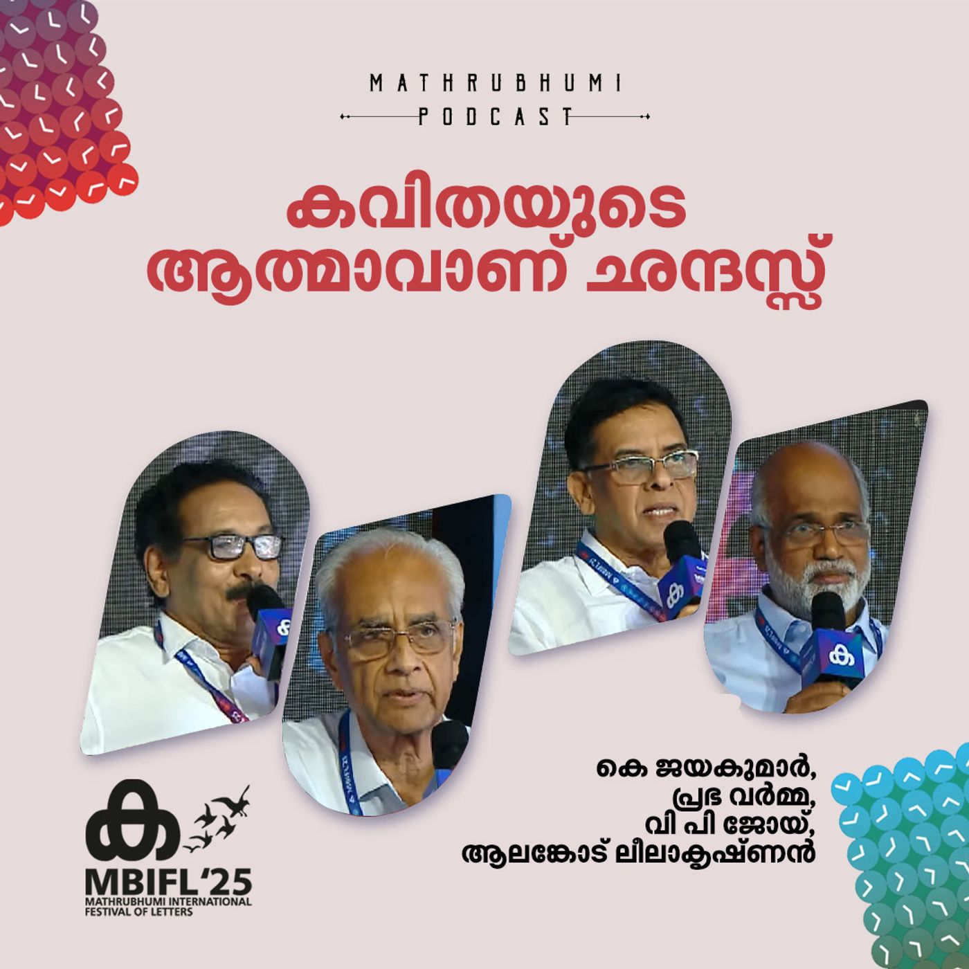 മാതൃഭൂമി അന്താരാഷ്ട്ര അക്ഷരോത്സവത്തിലെ 'കവിതയുടെ ആത്മാവാണ് ഛന്ദസ്സ്' എന്ന സെഷനില് കെ ജയകുമാര്, പ്രഭ വര്മ്മ, വി പി ജോയ്, എന്നിവര് സംസാരിക്കുന്നു. ഹോസ്റ്റ്: ആലങ്കോട് ലീലാകൃഷ്ണന് . സൗണ്ട് മിക്സിങ്: എസ്.സുന്ദര്