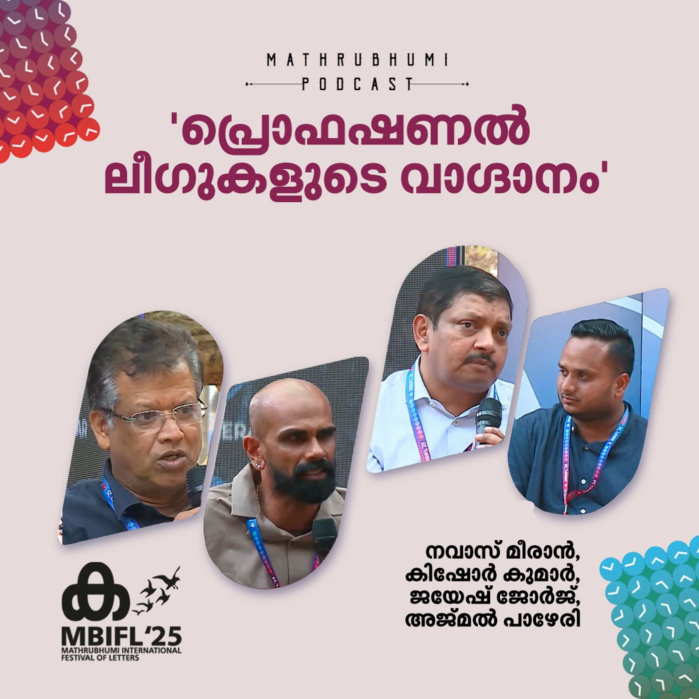 മാതൃഭൂമി അന്താരാഷ്ട്ര അക്ഷരോത്സവത്തിലെ 'പ്രൊഫഷണൽ ലീഗുകളുടെ വാഗ്ദാനം' എന്ന സെഷനിൽ നവാസ് മീരാൻ, കിഷോർ കുമാർ, ജയേഷ് ജോർജ് എന്നിവർ സംസാരിക്കുന്നു.