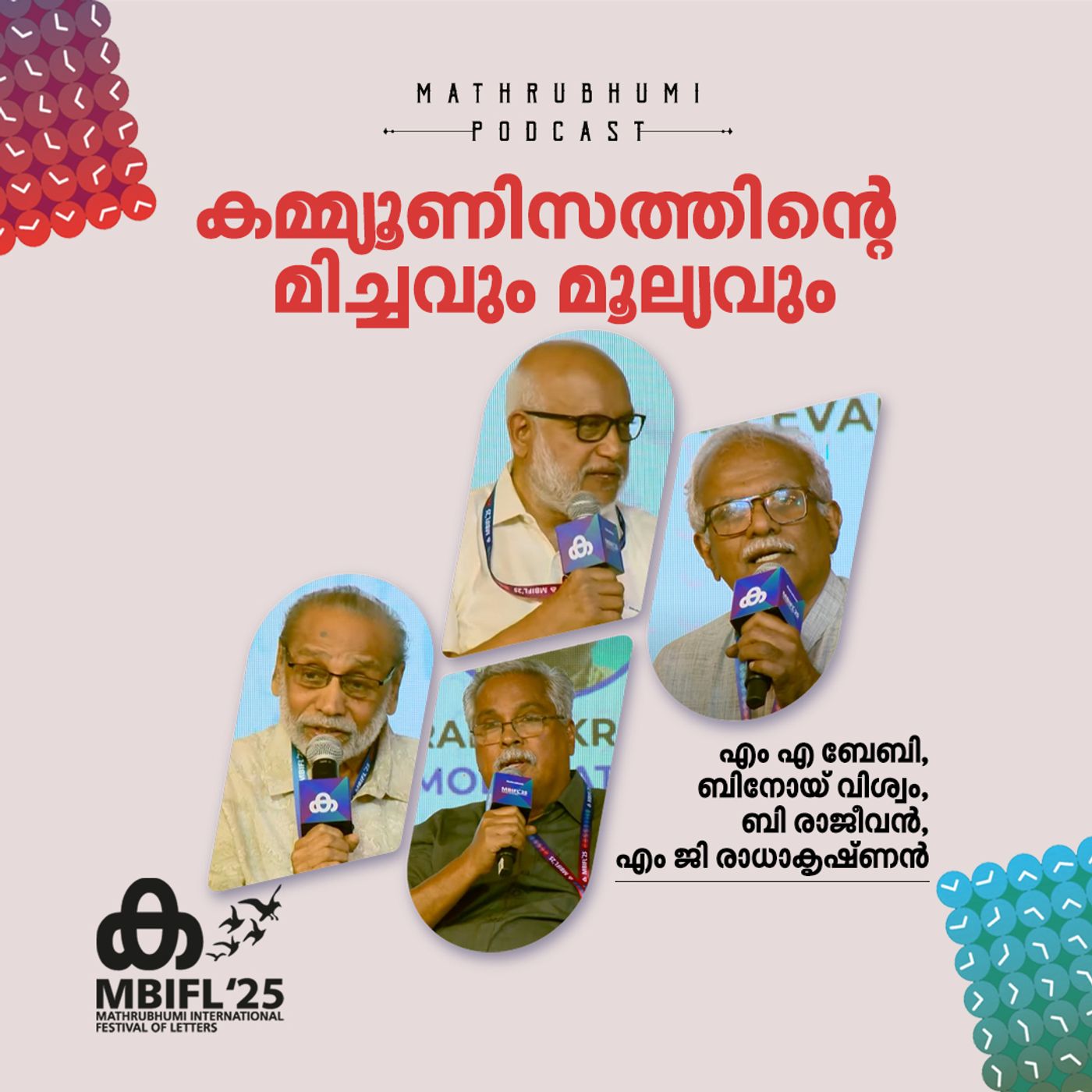 മാതൃഭൂമി അന്താരാഷ്ട്ര അക്ഷരോത്സവത്തിലെ 'കമ്മ്യൂണിസത്തിന്റെ മിച്ചവും മൂല്യവും' എന്ന സെഷനില് എം എ ബേബി, ബിനോയ് വിശ്വം, ബി രാജീവന്, എം ജി രാധാകൃഷ്ണന് എന്നിവര് സംസാരിക്കുന്നു. സൗണ്ട് മിക്സിങ്: എസ്.സുന്ദര്