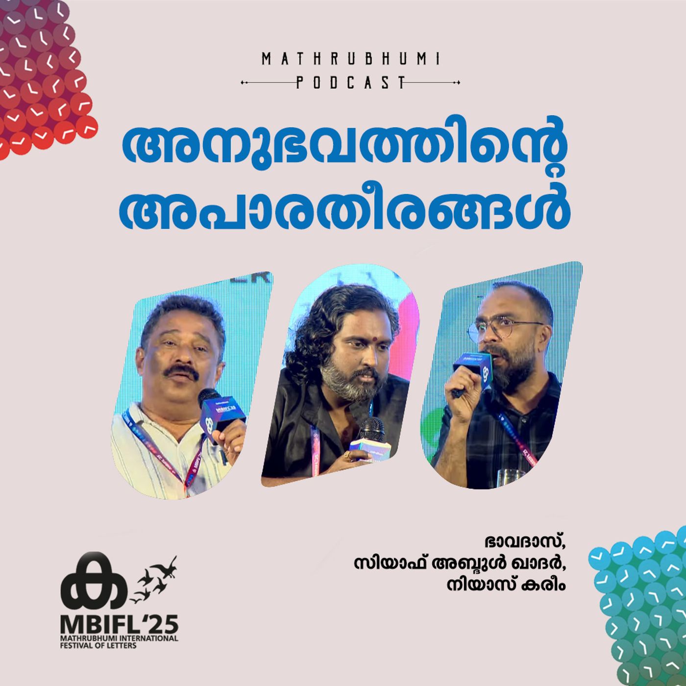 മാതൃഭൂമി അന്താരാഷ്ട്ര അക്ഷരോത്സവത്തിലെ 'അനുഭവത്തിന്റെ അപാരതീരങ്ങള്' എന്ന സെഷനില് ഭാവദാസ്, സിയാഫ് അബ്ദുള് ഖാദര് എന്നിവര് സംസാരിക്കുന്നു. ഹോസ്റ്റ്: നിയാസ് കരീം. സൗണ്ട് മിക്സിങ്: എസ്.സുന്ദര്