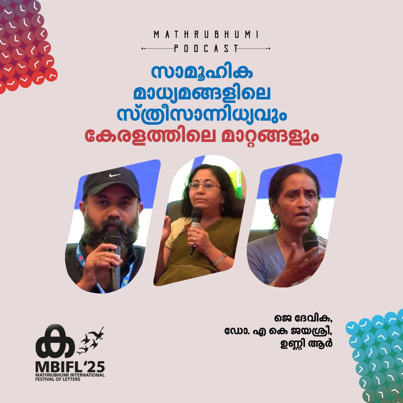 2018 മാതൃഭൂമി അന്താരാഷ്ട്ര അക്ഷരോത്സവത്തിലെ 'സാമൂഹിക മാധ്യമങ്ങളിലെ സ്ത്രീസാന്നിധ്യം എന്തു മാറ്റങ്ങളാണ് കേരളത്തില് ഉണ്ടാക്കിയിരിക്കുന്നത്?' എന്ന സെഷനിൽ ജെ ദേവിക, ഡോ. എ കെ ജയശ്രീ, ഉണ്ണി ആർ എന്നിവർ സംസാരിക്കുന്നു.