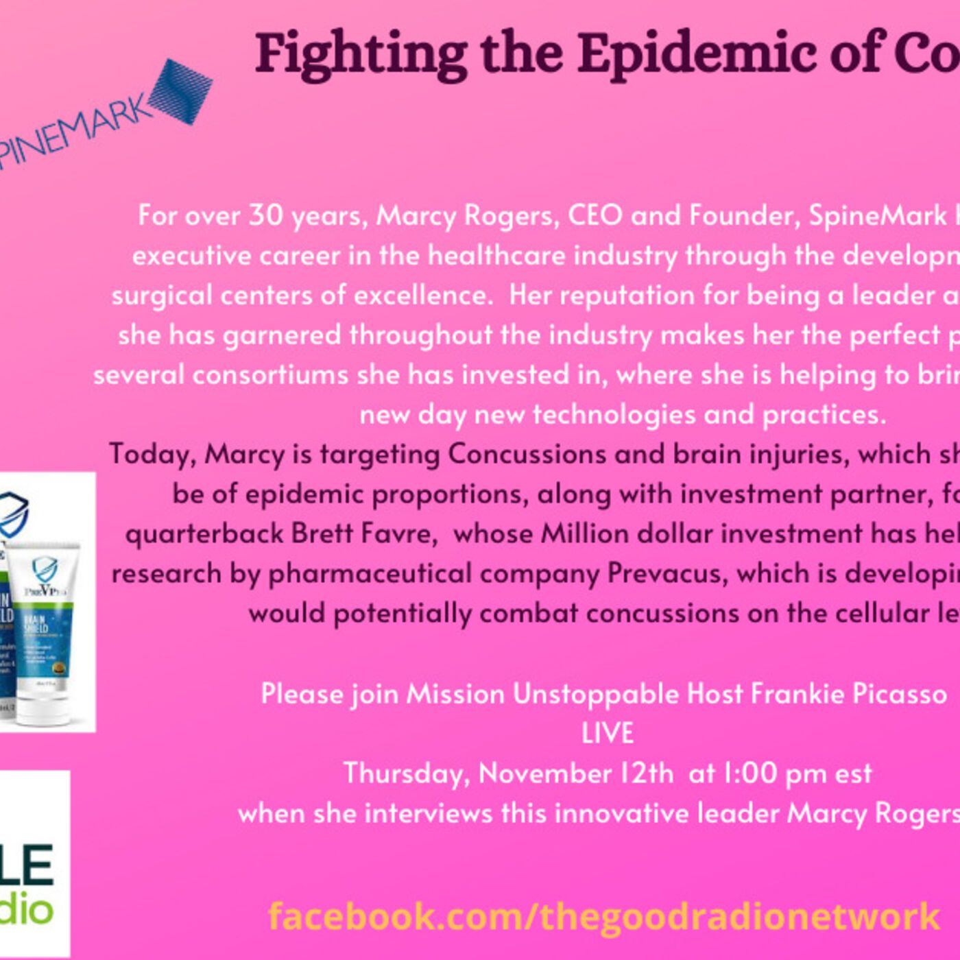 At her core, she is focused on the patient to the extent that she created several 501c3 charities, to assist patients to pay or totally fund their treatments. Currently the products she has brought to market include, Prevacus, a drug that would battle concussions on the cellular level and PREVPRO already on the market - PreVPro, a "brain shield" topical cream that claims to "prophylactically support the brain" if applied before activities that could result in head impact. Brett Farve is a major investor in this product.