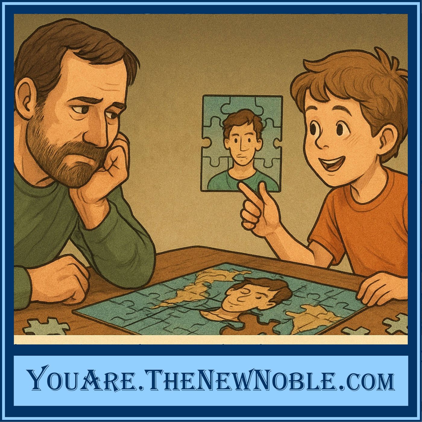 "The Puzzle of Wholeness" – by The New Noble™ There was once a father who sat at his desk late into the night, trying to assemble a puzzle. It was intricate, the pieces strange, and the image—a world map—felt impossibly hard to piece together. Hours passed, yet the continents refused to align. The next morning, the father left his work unfinished. His young son wandered into the room, spotted the puzzle, and began to play with it. In a surprisingly short time, the boy had completed it. When the father returned, his eyes widened.