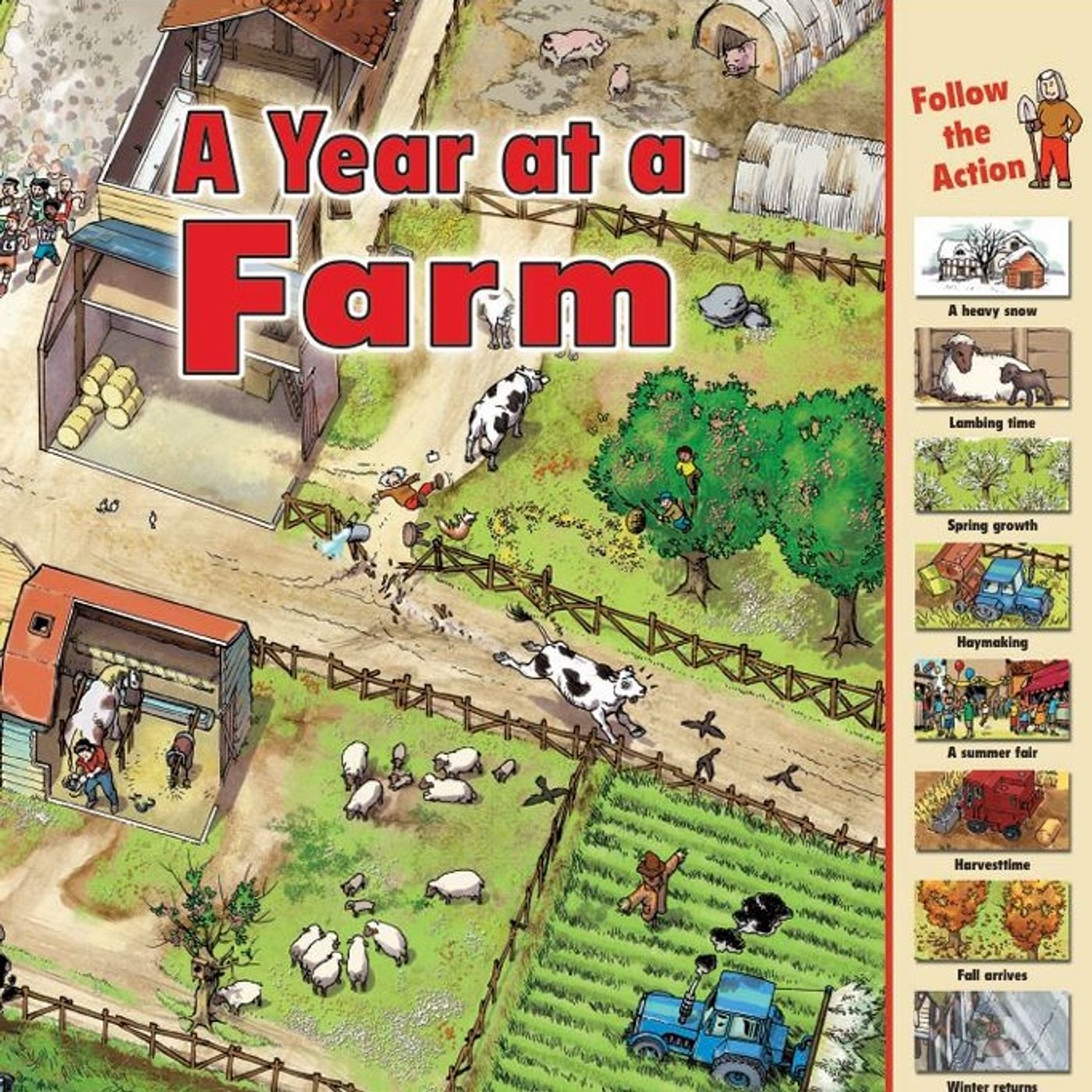 Explores the changing seasons and daily operations of a working farm. Through consistent bird’s-eye views, the text invites readers to observe how the landscape and tasks shift from the snowy winters of January to the autumn harvests. Key events include the birth of lambs in spring, summer haymaking, and the excitement of a local fair. Alongside agricultural duties, a recurring cast of characters and a team of archaeologists provide a narrative for readers to follow. Interactive elements encourage children to locate specific items and animals hidden within the detailed illustrations. Ultimately, the source serves as an educational guide to the cyclical nature of rural life and food production.