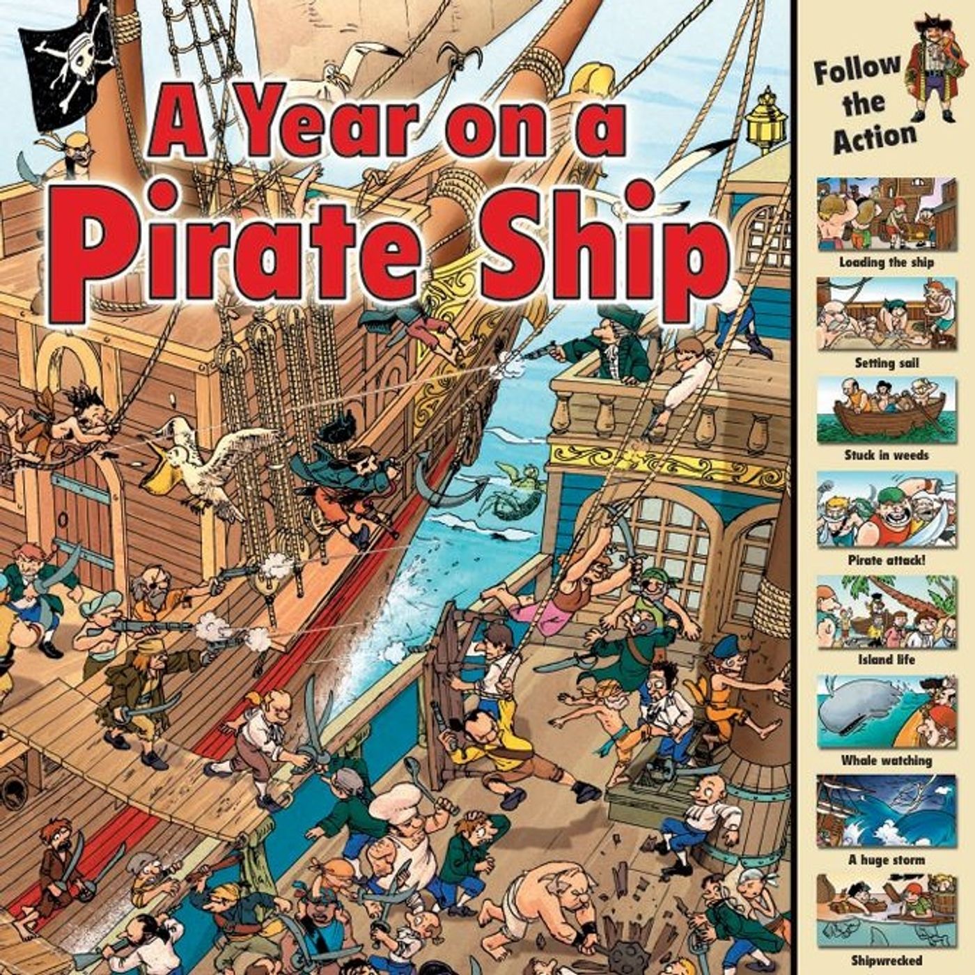 Follows the adventures of a seafaring crew over a twelve-month period. Through a series of detailed, busy illustrations, the book depicts the daily realities of pirate life, ranging from the mundane task of scrubbing decks to the high-stakes excitement of raiding merchant vessels. Readers are encouraged to engage with the story by locating specific characters and hidden objects, such as a clumsy pirate or a stowaway turtle, as the ship travels through various seasons and challenges. The narrative arc traces a chronological journey that begins with loading supplies in January and moves through events like getting stuck in weeds, enjoying island life, and surviving a massive storm. Ultimately, the collection of scenes provides a humorous and educational look at maritime history, concluding with the dramatic aftermath of a shipwreck.
