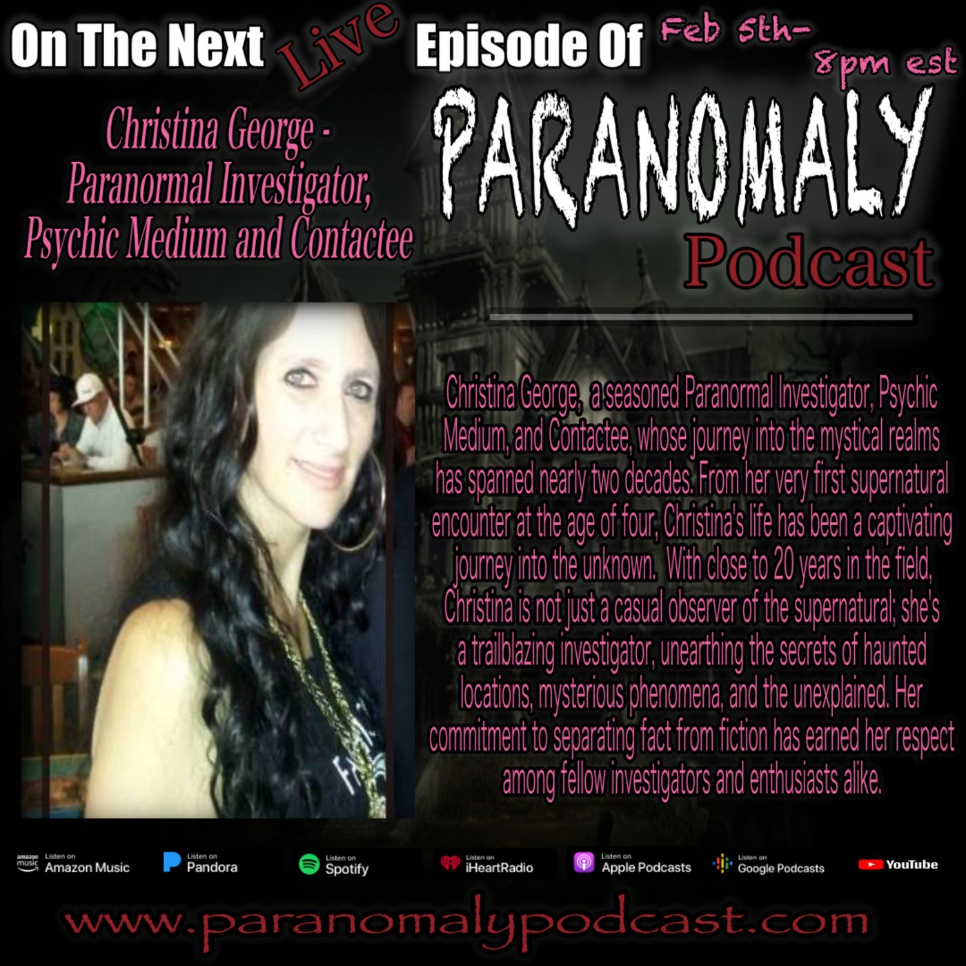 With close to 20 years in the field, Christina George is not just a casual observer of the supernatural; she's a trailblazing investigator, unearthing the secrets of haunted locations, mysterious phenomena, and the unexplained. Her commitment to separating fact from fiction has earned her respect among fellow investigators and enthusiasts alike.