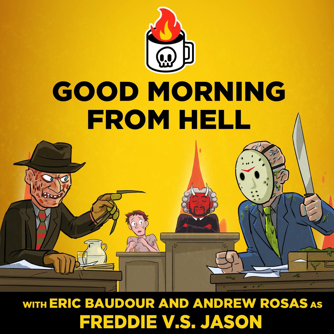 In a special small-claims courtroom episode, our hosts arbitrate a legal dispute between Freddy Kruger and Jason Voorhees over victim custody, late rent, and other roommate issues. Special guest Eric Baudour from the Face Jam podcast and comedian Andrew Rosas! Join our Hatreon to support the show and get exclusive content at goodmorningfromhell.com!