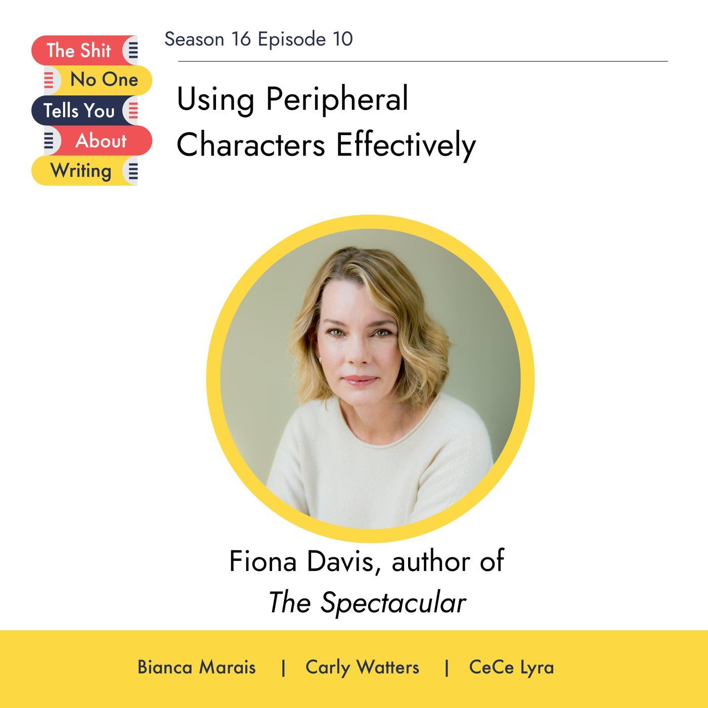 In today’s episode, Fiona Davis joins Bianca, Carly, and CeCe to critique Books with Hooks submissions while also talking about her latest novel, The Spectacular. During the episode, they discuss achieving NYT Bestselling status several times over; having messy story setups and high stakes; interiority and emotionality; ensuring there are obstacles in the main character’s way right from the start; knowing what the main character wants; passive query letters; why having more plot and less talk of themes in a query letter matters; not starting in an obvious place; having description accomplish more than one thing; researching and choosing a setting; outlining and reverse outlining; and using peripheral characters brilliantly.Find us on our socials:Twitter: @TSNOTYAW @BiancaM_author @carlywatters @ceciliaclyraInstagram: https://www.instagram.com/the_shit_about_writing/https://www.instagram.com/biancamarais_author/https://www.instagram.com/carlywatters/ https://www.instagram.com/cece_lyra_agent/Facebook: https://www.facebook.com/TSNOTYAWWebsites: www.theshitaboutwriting.com, www.biancamarais.com, www.carlywatters.com and www.cecilialyra.comMore information about Fiona can be found at https://www.fionadavisbooks.com/. She's on Instagram http://instagram.com/fionadavisauthor, and Facebook https://www.facebook.com/FionaDavisAuthor