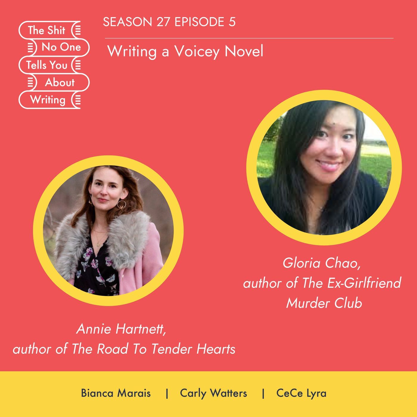 In part one of this week’s episode, Bianca sits down with bestselling author Annie Hartnett to dive into her poignant new novel, ‘The Road to Tender Hearts.’ Together, they unpack the novel’s rich themes of loss, redemption, and the beautifully messy nature of human connection. Annie shares her behind-the-scenes writing process, why voice matters more than ever, and how she balances humor with heartbreak. They also explore the magic—and challenge—of writing in an omniscient POV, plus the personal moments that breathe life into her fiction.In part two of this week’s episode, Bianca sits down with award-winning author Gloria Chao to talk about her latest novel, ‘Ex-Girlfriend Murder Club’. Gloria opens up about her unconventional leap from dentistry to fiction, the magic of crafting unforgettable character voices, and how she navigates bold genre shifts. With candor and humor, she pulls back the curtain on the publishing world—sharing what she’s learned about working with agents, honing your craft, and standing out in a crowded market. Packed with laughs, inspiration, and practical tips, this is a must-listen for any aspiring author.Note: Cece Lyra is a literary agent at Wendy Sherman Associates. If you’d like to query CeCe, please refer to the submission guidelines at www.wsherman.com. Carly Watters is a literary agent at P.S. Literary Agency, but her work on this podcast is not affiliated with the agency, and the views expressed by Carly on this podcast are solely that of her as a podcast co-host and do not necessarily reflect the views, opinions, policies, or position of P.S. Literary Agency.