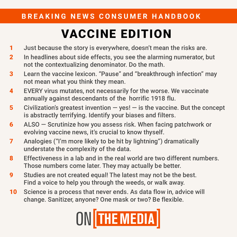 In the past week, we've seen the CDC pause distribution of the Johnson & Johnson vaccine and new cases among the vaccinated in Michigan — coming together to paint a somewhat bleak picture of the state-of-our-vaccines. Or so it might seem. In the latest edition of our Breaking News Consumer’s Handbooks, we examine the fuzzy math and misleading language that can cloud media coverage of vaccines. Brooke speaks with Nsikan Akpan, health and science editor for the WNYC Newsroom, and Kai Kupferschmidt, a science journalist based in Berlin who writes for Science Magazine.