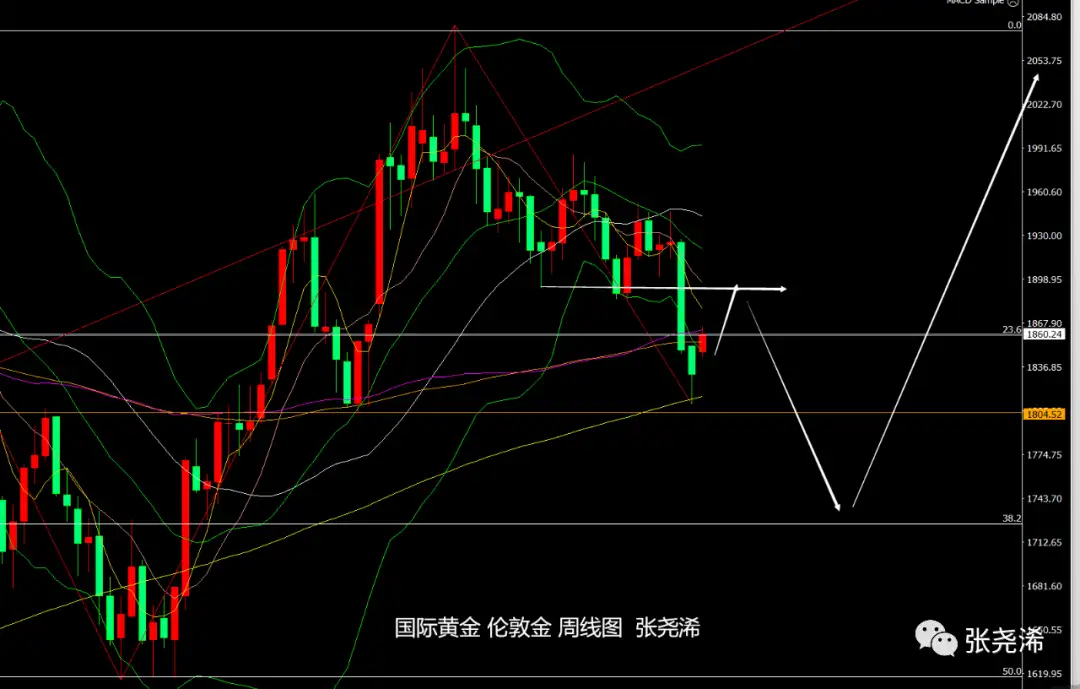 周线级别:金价上周触底200周均线支撑反弹回升,空头信号有所减弱,附图指标信号也有向上转强发展的倾向,主图ZZ指标早已触底显现,100周及200周均线也维持向上发展,暗示后市有望延续回升之力,展开走强,本周高开后保持动力反弹走强,也验证此观点有效。后市有望进一步反弹触及短期均线阻力目标以及中轨线附近阻力目标。