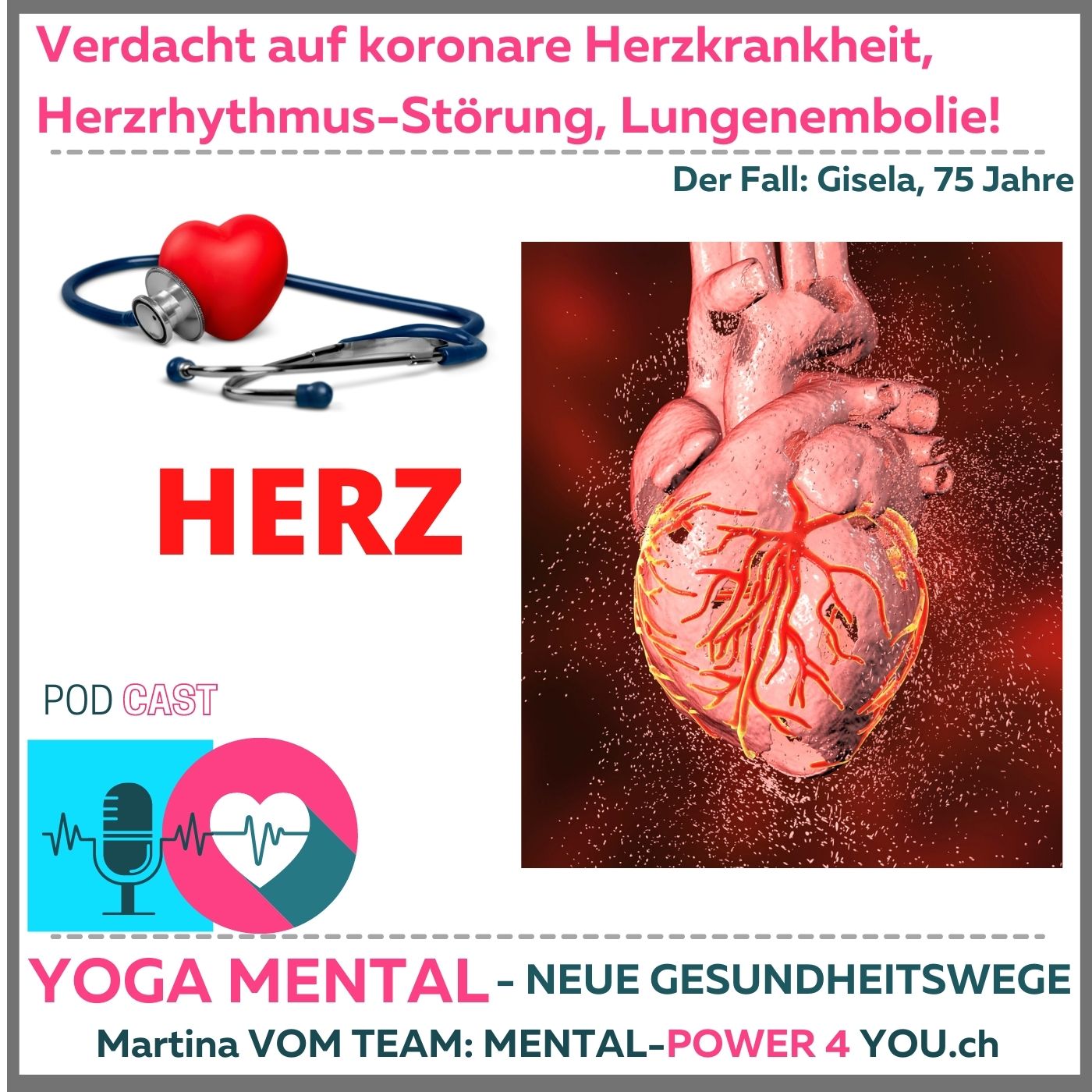 «Yoga-Mental» die neuen Gesundheitswege " frisch aus der Alltags Praxis vom Team http://Mental-Power4you.ch - Herzlich Willkommen liebe Zuhörer, heute mit dem Auftrag einer Kundin: «HILFE, Verdacht auf koronare Herzkrankheit, Herzrhythmus-Störung, Lungenembolie! »