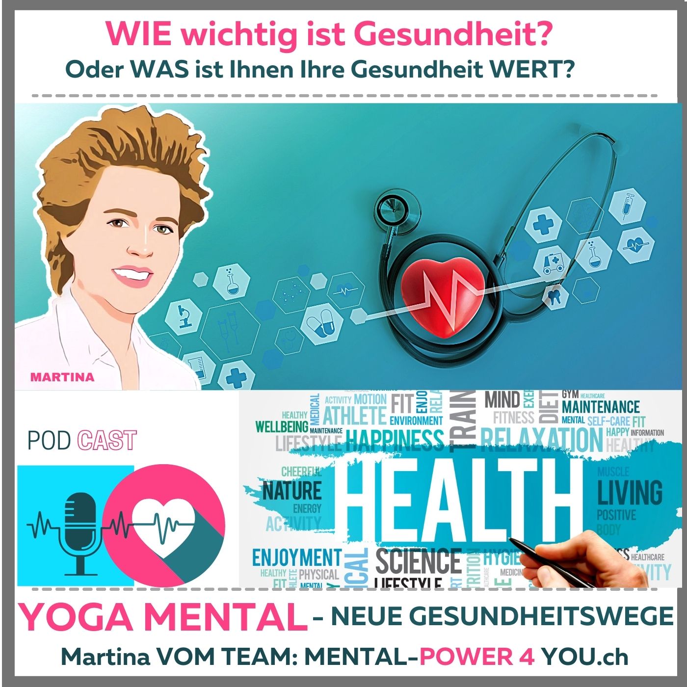 «Wie wichtig ist Ihnen Ihre Gesundheit? Oder WAS ist Ihnen Ihre Gesundheit WERT?» Friedrich Schiller geboren 1759 schrieb es schon nieder: «Es ist der Geist, der sich den Körper baut.» «Yoga-Mental» die neuen Gesundheitswege» frisch aus der Alltags Praxis vom Team http://Mental-Power4you.ch - Herzlich Willkommen liebe Zuhörer -Ich bin Martina - Ihre Gesundheitsagentin von Mental-Power4you.ch.